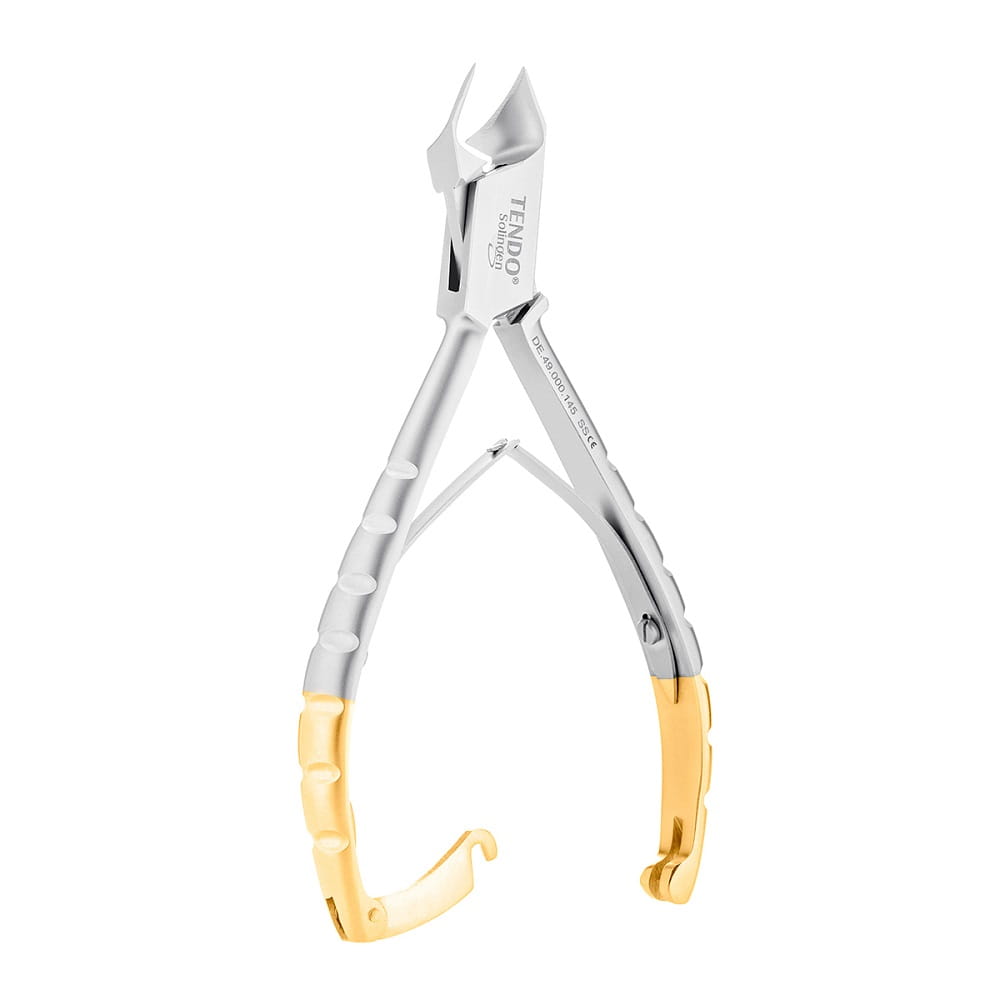 Profesjonalne cęgi podologiczne marki Tendo Solingen o długości 14 cm, wykonane z najwyższej jakości stali nierdzewnej, z ostrą, ściętą w dół końcówką, ergonomiczną rękojeścią z wypustkami, sprężyną wspomagającą nacisk oraz blokadą ramion, zapewniają precyzyjne, bezpieczne i komfortowe skracanie nawet najbardziej wymagających paznokci z możliwością wielokrotnej sterylizacji.